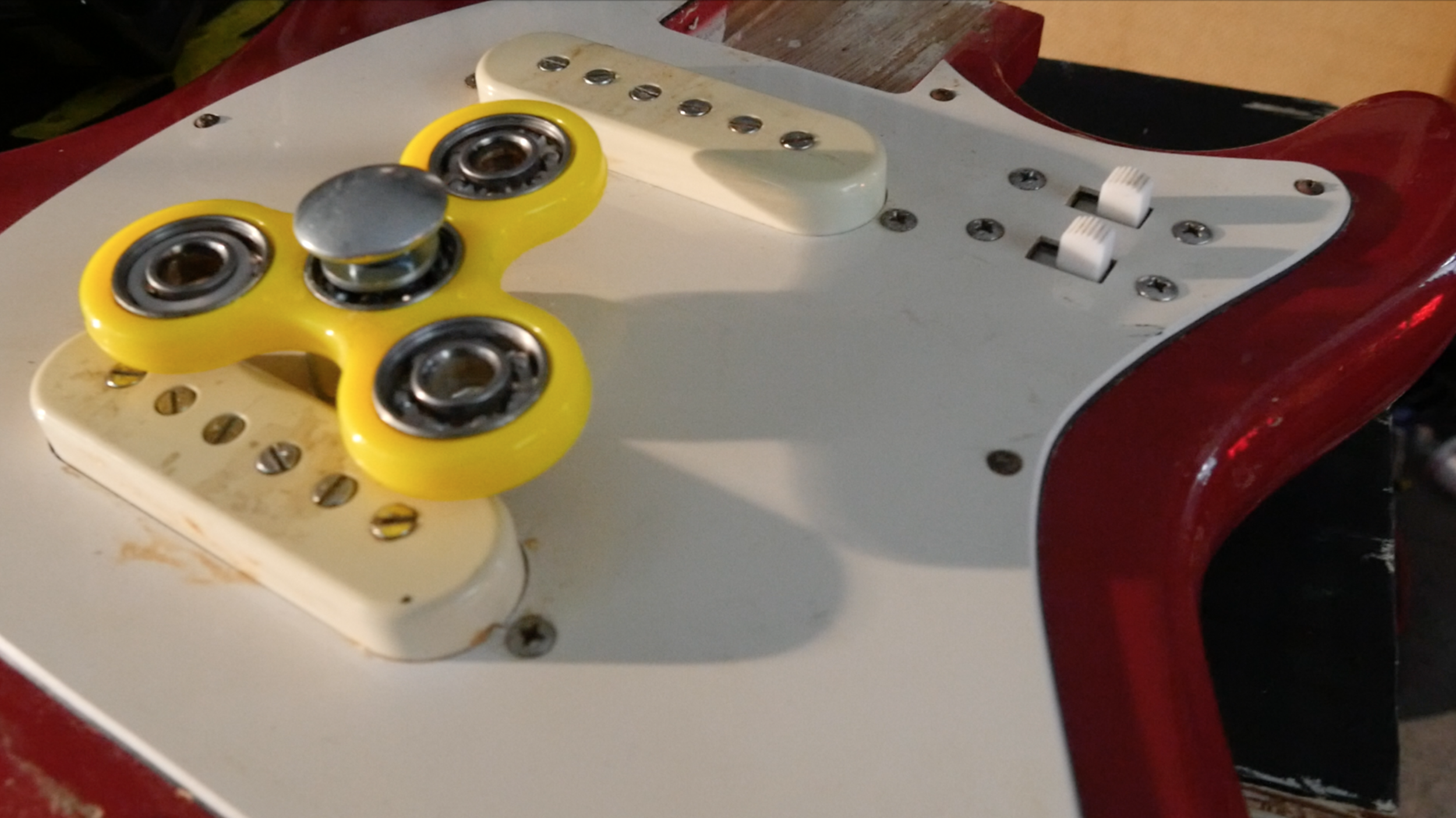 This is the fidget spinner guitar synth thing. It was talked about a few times people mentioned, either magnets, or guitar pickups and stuff. so needed to give it a go, if i didn't i wouldn't have know how awesome of a race car sound it makes. Its simply an old guitar, with a hole drilled in it, an M8 bolt holding a fidget spinner in place with a handful of washers. SIMPLE.